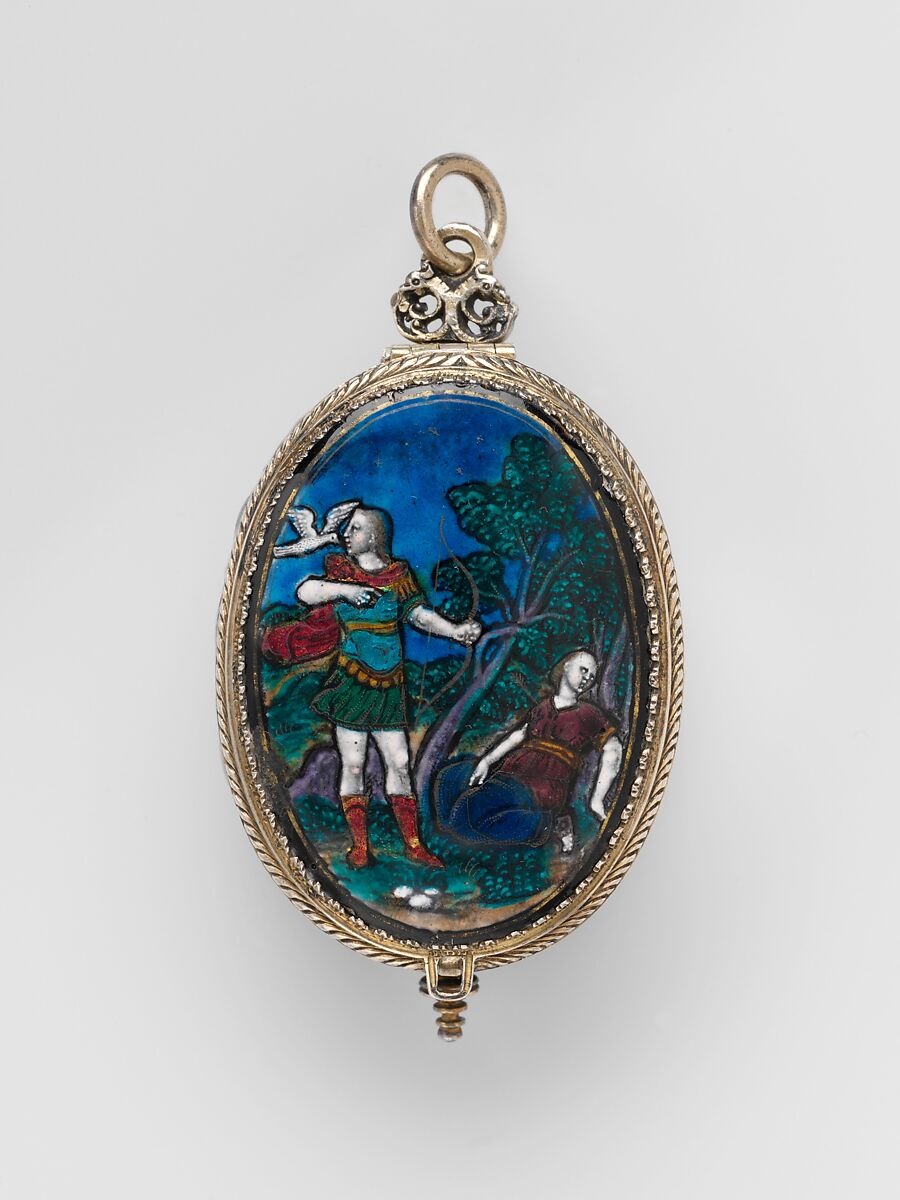 In the first quarter of the seventeenth century a small group of enamelers in Limoges produced polychrome painted enamels for watchcases. Most of the surviving enamels, including the one displayed here, were adapted from the woodcut illustrations by Bernard Salomon (1505/1510–ca. 1561) for the editions of Ovid’s Metamorphoses published in Lyon by Jean de Tournes beginning in 1555. The case of the watch was cleverly modified, probably at some time in the second half of the nineteenth century, to fit a movement of equal rarity.
