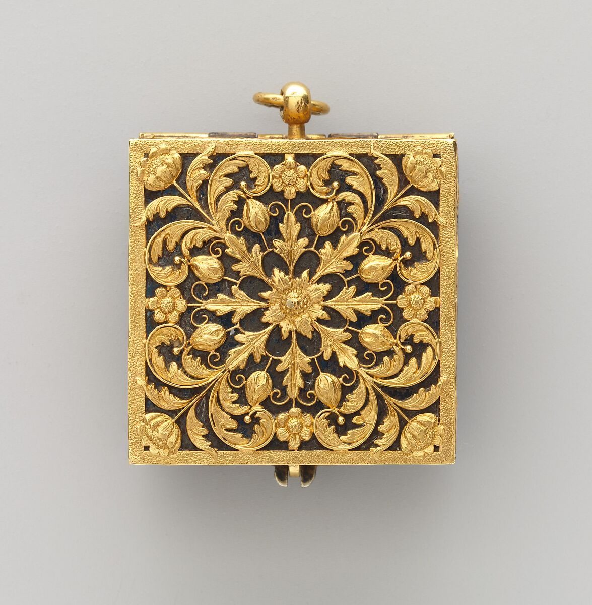 The exterior of the square gold case is covered with four side panels of delicately chased openwork of gold floral and foliate designs applied over blued-steel grounds. The same technique was used to create the openwork design of flowers and foliage radiating from a central blossom on the back of the case that, like the side panels, plays bright gold ornament against a dark blue ground. Hinged to the case is a square bezel with eight rose-cut diamonds set in silver and framing a beveled-edge plaque of rock crystal, the center polished as a lens through which the chapter ring on the dial can be viewed. The dial, pinned to the top plate of the movement, is made of white enamel with pink and blue floral designs painted in the spandrels and a dark blue basse-taille enameled center. The roman numerals (I–XII) of the chapter ring are painted in black enamel with half-hour divisions marked by radiating lines and quarter-hour divisions by lines painted on the inner edge of the chapter ring. The single hand is made of sculptured gold.