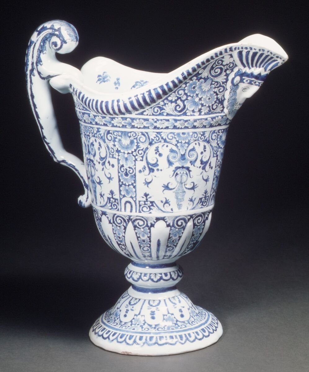 Faience, or tin-glazed and enameled earthenware, first emerged in France during the sixteenth century, reaching widespread usage among elite patrons during the seventeenth and early eighteenth centuries, prior to the establishment of soft-paste porcelain factories. Although characterized as more provincial in style than porcelain, French faience was used at the court of Louis XIV as part of elaborate meals and displays, with large-scale vessels incorporated into the Baroque garden designs of Versailles. Earlier examples of French faience attest to the strong influence of maiolica artists from Italy. Later works demonstrate the ways in which cities such as Nevers, Rouen, Lyon, Moustiers, and Marseille developed innovative vessel shapes and decorative motifs prized among collectors throughout Europe.