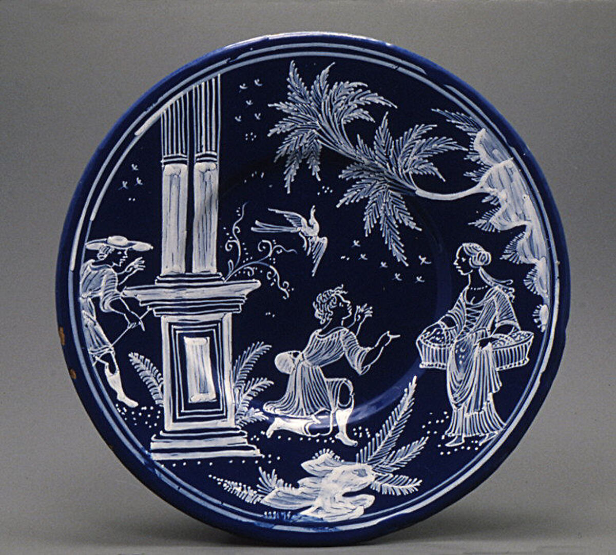This plate is decorated with a scene illustrating an episode in the pastoral romance L'Astrée (1610–1627) by Honoré d'Urfé (1568–1625).