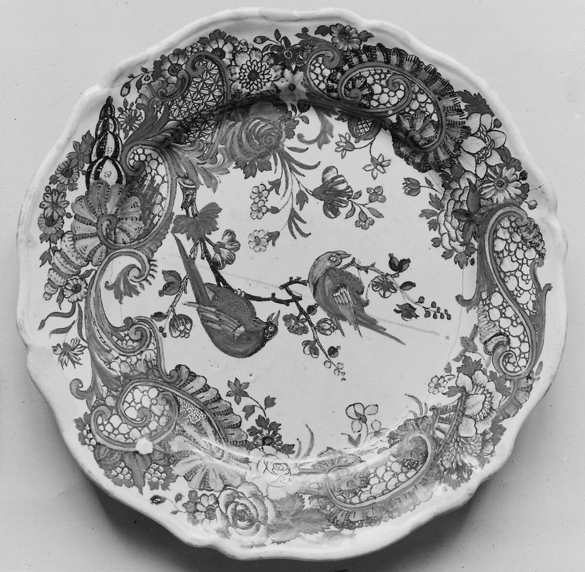 While faience can be created from a wide mixture of clays, it is foremost distinguished by the milky opaque white color achieved by the addition of tin oxide to the glaze. French faience is typically divided into two types. Grand feu (high fire) describes pieces that have been decorated with glaze and metallic oxides before being fired a single time at a high temperature of around 1650°F (900°C). Petit feu (low-fire) faience, developed in the second half of the eighteenth century, refers to a process whereby the clay body is fired before being glazed and decorated with metallic oxides and then fired again at a lower temperature; pieces can also go through a third firing. Grand feu pieces have a more limited color palette that consists of blue, yellow, brown-purple, and green. By contrast, the lower firing temperature of petit feu faience enabled both greater precision in painting techniques and variety in the range of colors.