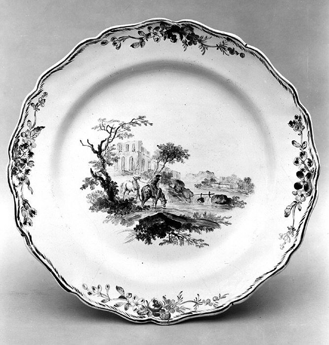 While faience can be created from a wide mixture of clays, it is foremost distinguished by the milky opaque white color achieved by the addition of tin oxide to the glaze. French faience is typically divided into two types. Grand feu (high fire) describes pieces that have been decorated with glaze and metallic oxides before being fired a single time at a high temperature of around 1650°F (900°C). Petit feu (low-fire) faience, developed in the second half of the eighteenth century, refers to a process whereby the clay body is fired before being glazed and decorated with metallic oxides and then fired again at a lower temperature; pieces can also go through a third firing. Grand feu pieces have a more limited color palette that consists of blue, yellow, brown-purple, and green. By contrast, the lower firing temperature of petit feu faience enabled both greater precision in painting techniques and variety in the range of colors.