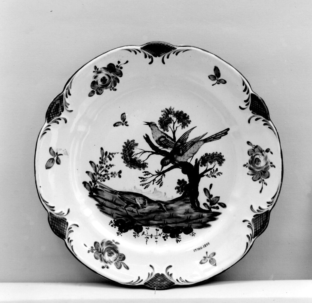 While faience can be created from a wide mixture of clays, it is foremost distinguished by the milky opaque white color achieved by the addition of tin oxide to the glaze. French faience is typically divided into two types. Grand feu (high fire) describes pieces that have been decorated with glaze and metallic oxides before being fired a single time at a high temperature of around 1650°F (900°C). Petit feu (low-fire) faience, developed in the second half of the eighteenth century, refers to a process whereby the clay body is fired before being glazed and decorated with metallic oxides and then fired again at a lower temperature; pieces can also go through a third firing. Grand feu pieces have a more limited color palette that consists of blue, yellow, brown-purple, and green. By contrast, the lower firing temperature of petit feu faience enabled both greater precision in painting techniques and variety in the range of colors.