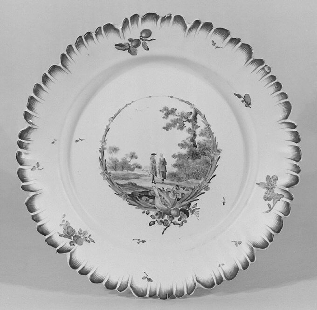 While faience can be created from a wide mixture of clays, it is foremost distinguished by the milky opaque white color achieved by the addition of tin oxide to the glaze. French faience is typically divided into two types. Grand feu (high fire) describes pieces that have been decorated with glaze and metallic oxides before being fired a single time at a high temperature of around 1650°F (900°C). Petit feu (low-fire) faience, developed in the second half of the eighteenth century, refers to a process whereby the clay body is fired before being glazed and decorated with metallic oxides and then fired again at a lower temperature; pieces can also go through a third firing. Grand feu pieces have a more limited color palette that consists of blue, yellow, brown-purple, and green. By contrast, the lower firing temperature of petit feu faience enabled both greater precision in painting techniques and variety in the range of colors.