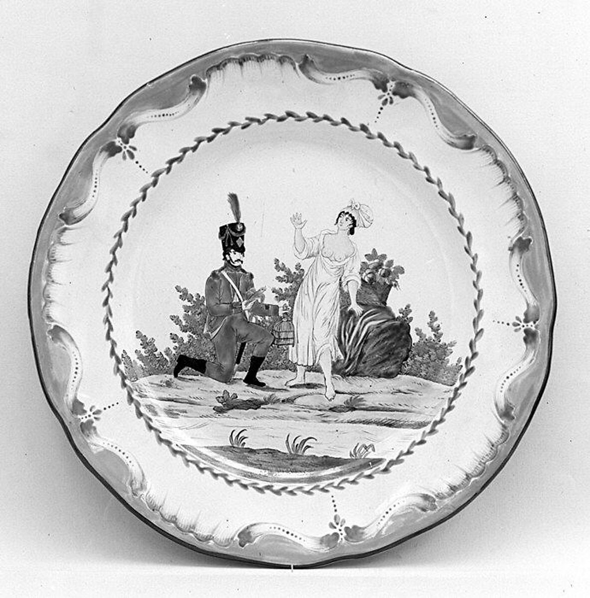 While faience can be created from a wide mixture of clays, it is foremost distinguished by the milky opaque white color achieved by the addition of tin oxide to the glaze. French faience is typically divided into two types. Grand feu (high fire) describes pieces that have been decorated with glaze and metallic oxides before being fired a single time at a high temperature of around 1650°F (900°C). Petit feu (low-fire) faience, developed in the second half of the eighteenth century, refers to a process whereby the clay body is fired before being glazed and decorated with metallic oxides and then fired again at a lower temperature; pieces can also go through a third firing. Grand feu pieces have a more limited color palette that consists of blue, yellow, brown-purple, and green. By contrast, the lower firing temperature of petit feu faience enabled both greater precision in painting techniques and variety in the range of colors.