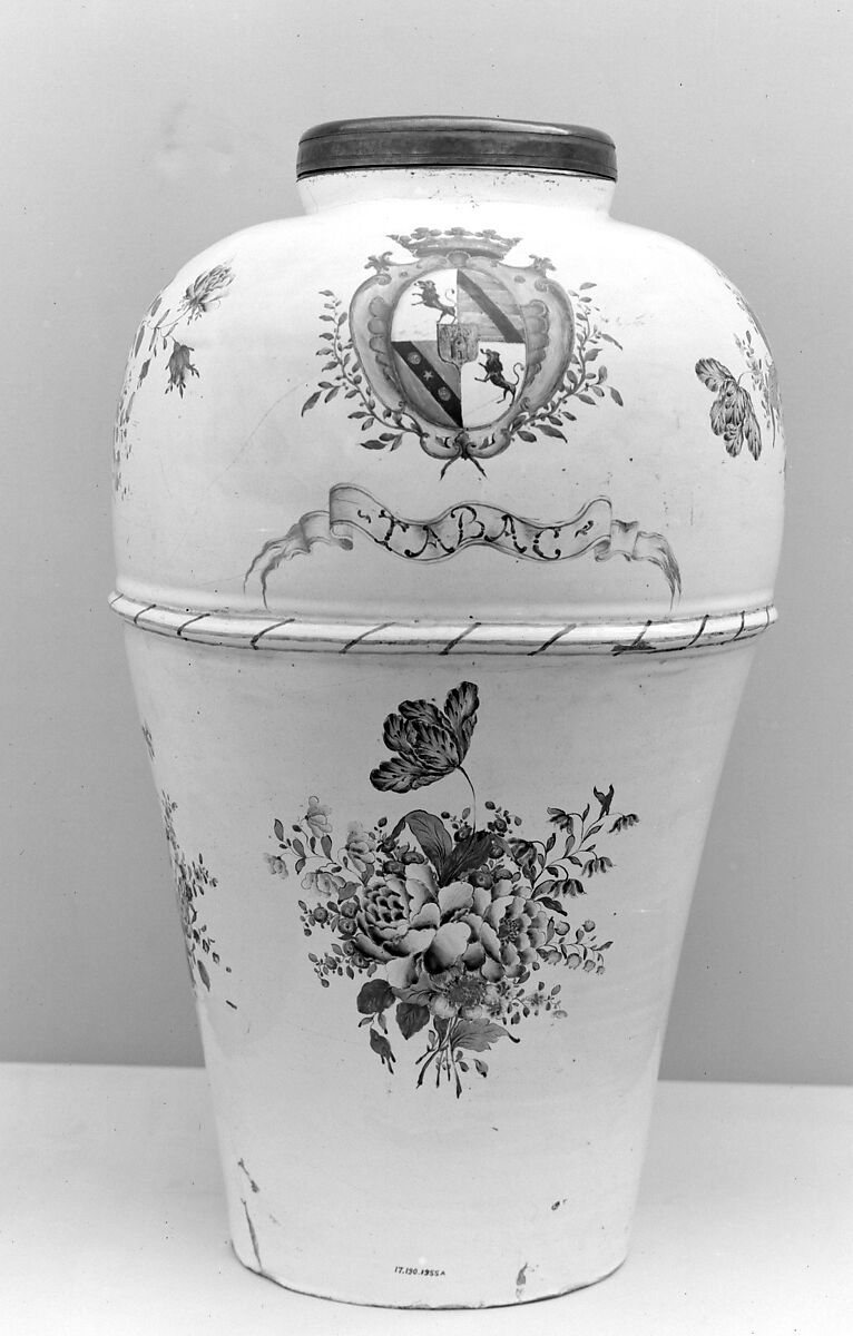 - Medium: Faience (tin-glazed earthenware); pewter cover