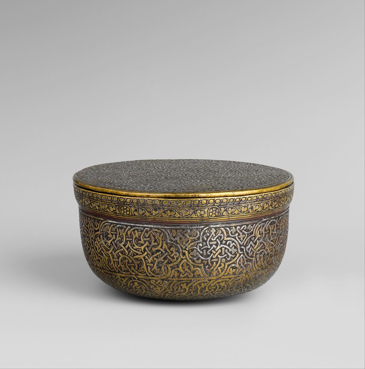 Round bottom boxes with lids are rare in Islamic metalwork but curiously common in the oeuvres of Mahmud al-Kurdi and Zain al-Din. The original function of this elegant little box is unknown. Sweetmeats may have been served in it, but the similarity in its size and capacity to other boxes lends support to the idea that it was used to transport pre-packed speziere minute or sottili (valuable spices exported in small quantities to Europe).