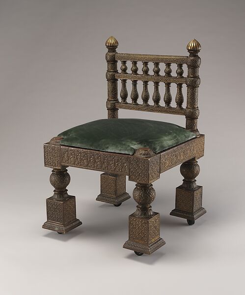 As a purveyor of Indian goods, de Forest copied this design from a silver chair he had seen and admired in Jodhpur. He then asked the mistri (a subcaste of skilled craftsmen in India) to translate his drawing into a chased brass side chair. This particular chair was fully constructed from teakwood and then covered with brass ornamented with floral designs in repoussé, a metalworking technique in which a malleable metal is shaped by hammering from the reverse side to create a design in relief. This chair epitomizes de Forest’s role not only as a tastemaker and designer who was directly involved with the work of the craftsmen, but that of an ardent patron of the traditional methods of production employed by the mistri.