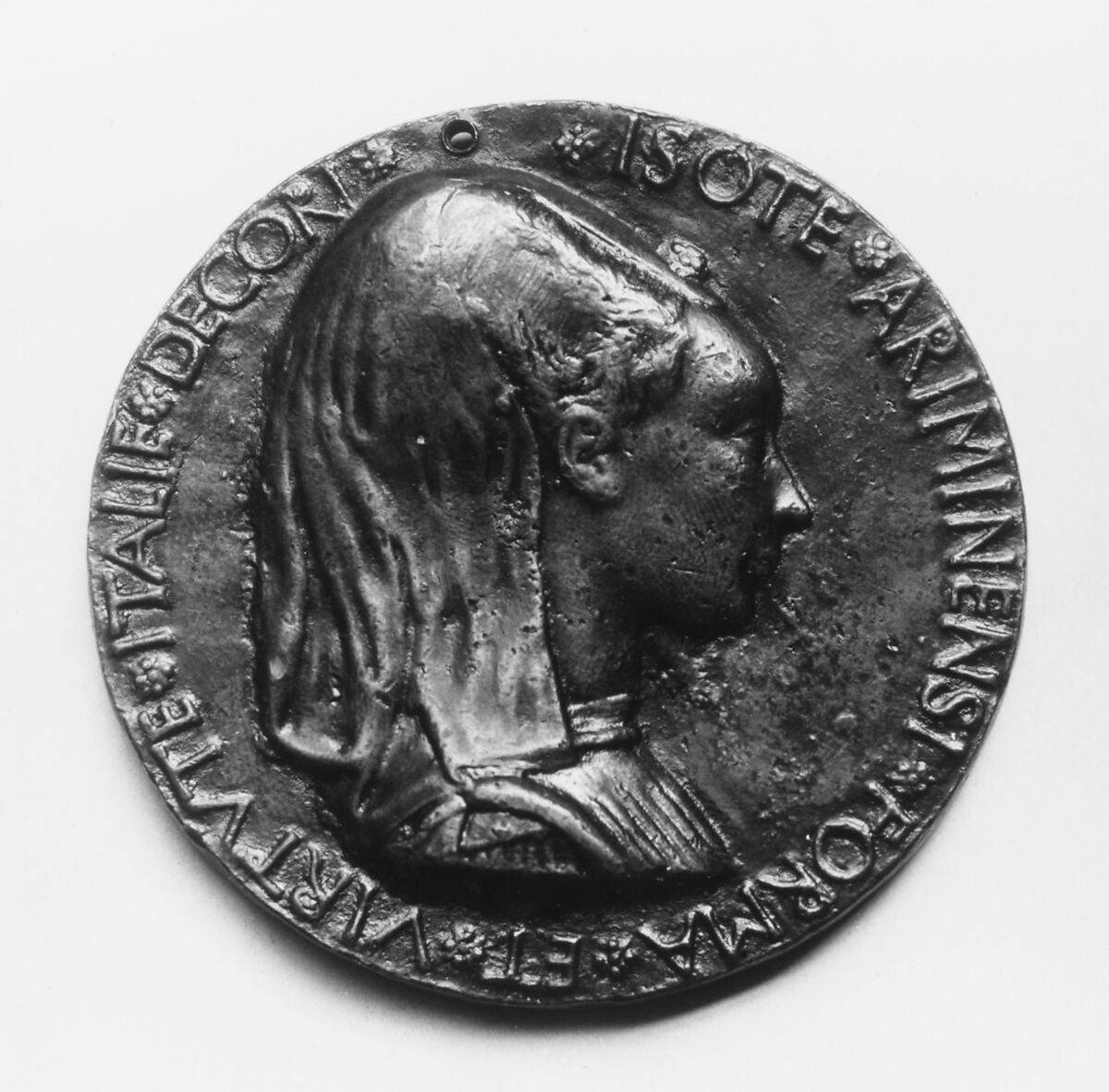 Obverse: Following her name, in the part of the inscription that is often occupied by a sitter’s title, Isotta is said to have ornamented all Italy by her beauty and virtue, two concepts that were considered strictly interrelated. Isotta was the mistress of the Lord of Rimini. Most unusually, they went on to marry. This medal sought to legitimize their union then and forever.