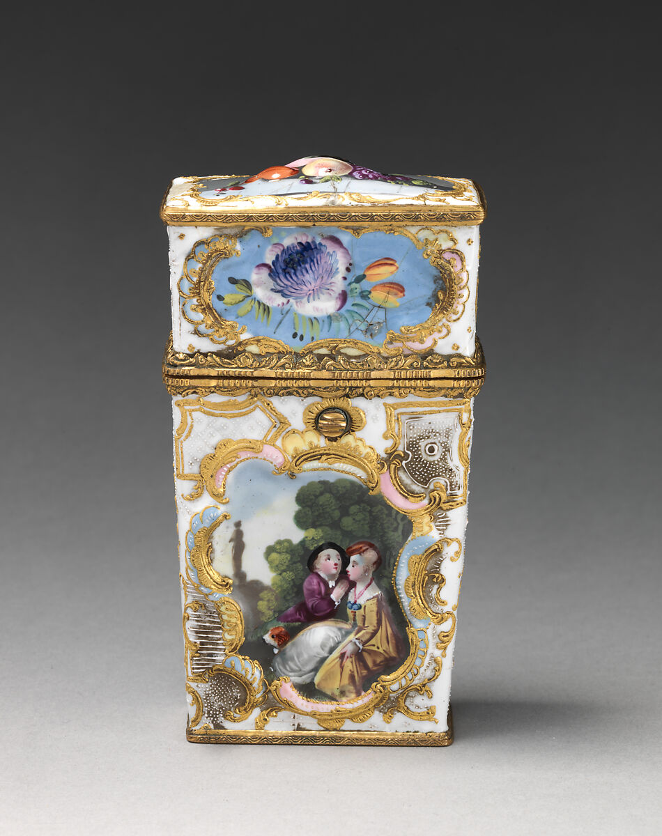 Enameled objects like this one, intended to imitate the lustrous quality of porcelain, were among the more affordable goods sold at toyshops across London and in fashionable English resort towns. Though often called "Battersea enamels" in common parlance (referring to the manufactory at York House, Battersea, operating only between 1753 and 1756), we rarely know exactly where individual pieces were made. The main centers of enamel production were in London, South Staffordshire (particularly in Bilston and Wednesbury), and Birmingham.