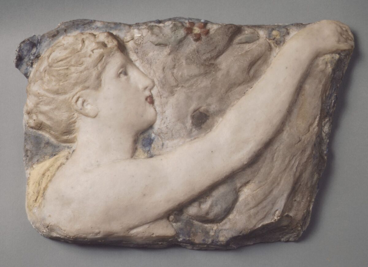 This fragment shows Pasiphaë adorning the horns of a bull with a garland of flowers, which is a story from Greek mythology. Cros’s subject matter, his use of the palest possible tones and the softness of the modeling designed to give an indefinite impression, are in accord with the Symbolist trends of the years 1880–90. Pâte-de-verre was a material made from variously colored powdered glass placed in a clay mold and then fired in a kiln. Cros developed the technique in 1893.