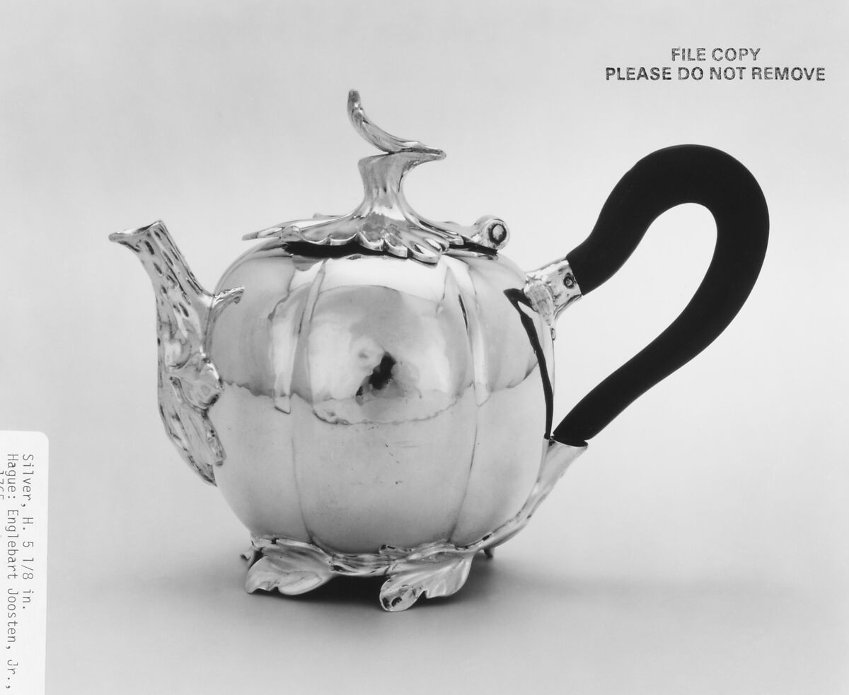 The son of a silversmith by the same name, Engelbart Joosten was born in The Hague where he became a master of the silversmiths’ guild in 1764. He also served as assayer and dean of the guild between 1767 and 1797. Known as one of the best silversmiths in The Hague, he was appreciated for his elegant vessels influenced by naturalism and the curvilinear lines of the Rococo. The chased body of the teapot has the shape of a melon consisting of six plain lobes. The pot is fitted with a hinged lid cast in the form of a leaf with a naturalistically shaped stalk serving as knob. The gnarled spout is also decorated with foliate motifs, while the feet are cast in the form of a knobbly and twisted branch with leaves. The gracefully-curving handle is made of ebony.
