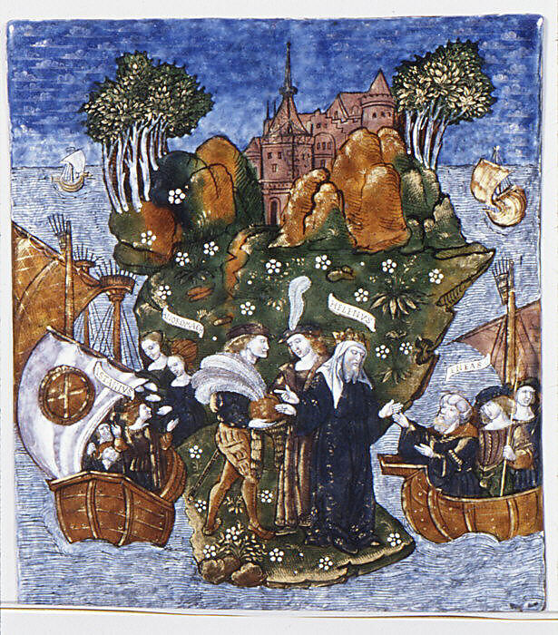 European of the Renaissance period viewed ancient Rome not only as the origin of Italian civilzation but also the geographic center of a lost golden age. This plaque belongs to a series of at least eighty Limoges enamels illustrating events from Virgil’s Aeneid. The Latin epic poem tells the story of the legendary hero Aeneas, who escaped the sack and burning of Troy by the Greeks and, after wandering for some time, settled in Italy, where his descendants founded Rome.
