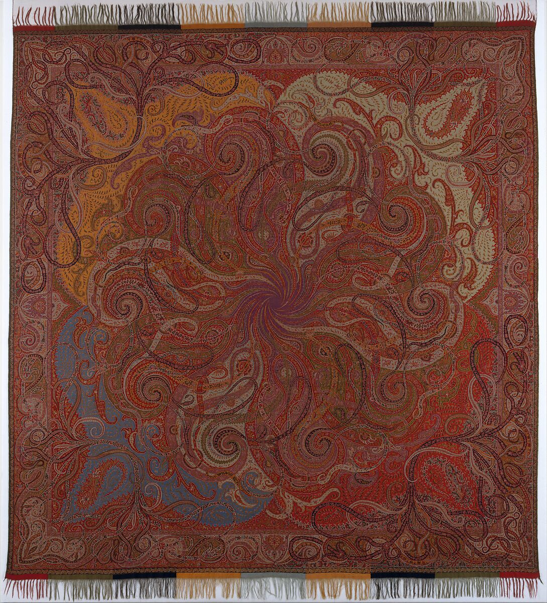 Stylistically, this shawl demonstrates both a "four seasons" layout—in which the ground color is different in each of the quadrants—and an organization a la pivot, indicating the manner in which the vegetation swirls around a central point. The design for the shawl is probably French, but it may have been purchased by a Scottish manufacturer and jacquard-woven in Paisley.