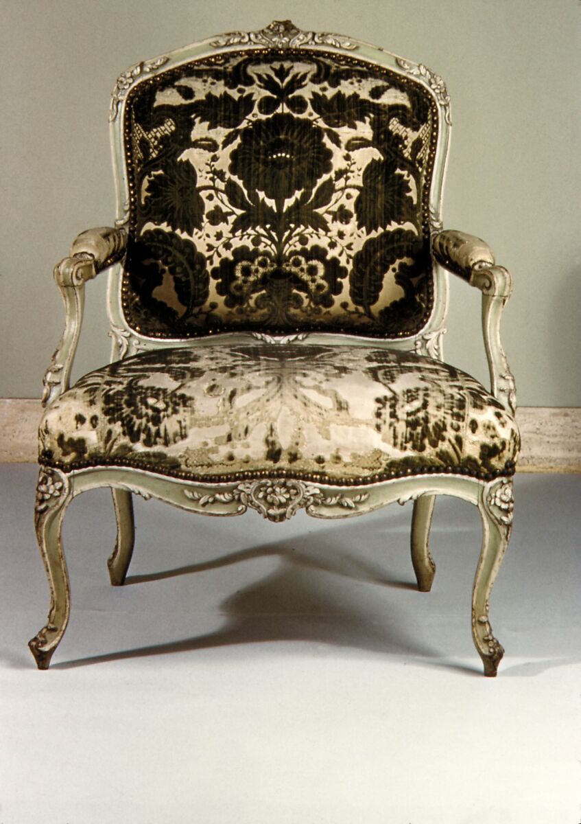 - Medium: Carved and painted beechwood; cut and voided velvet upholstery