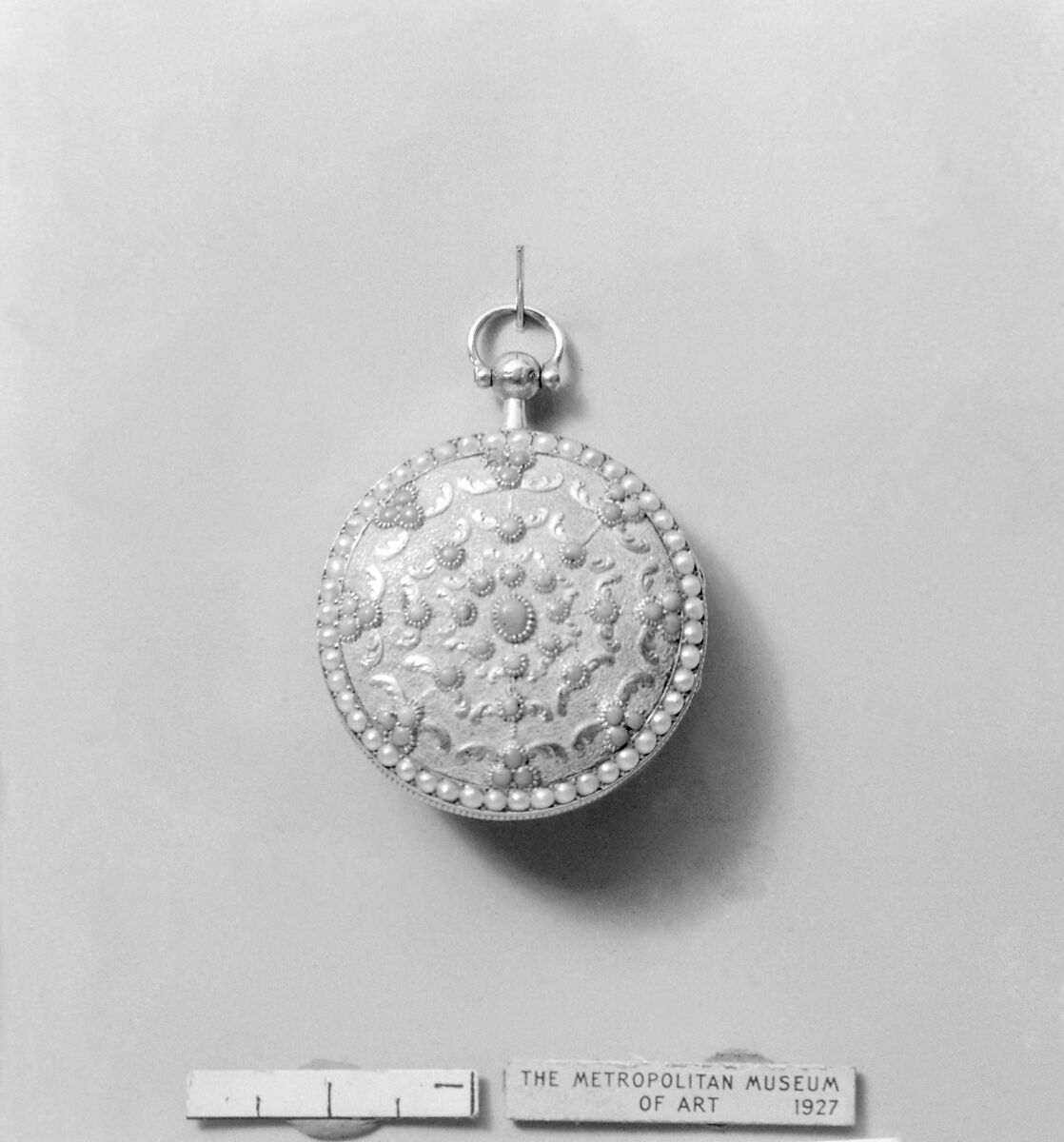 - Medium: Case of gold and pearls, with radiating design of turqoises