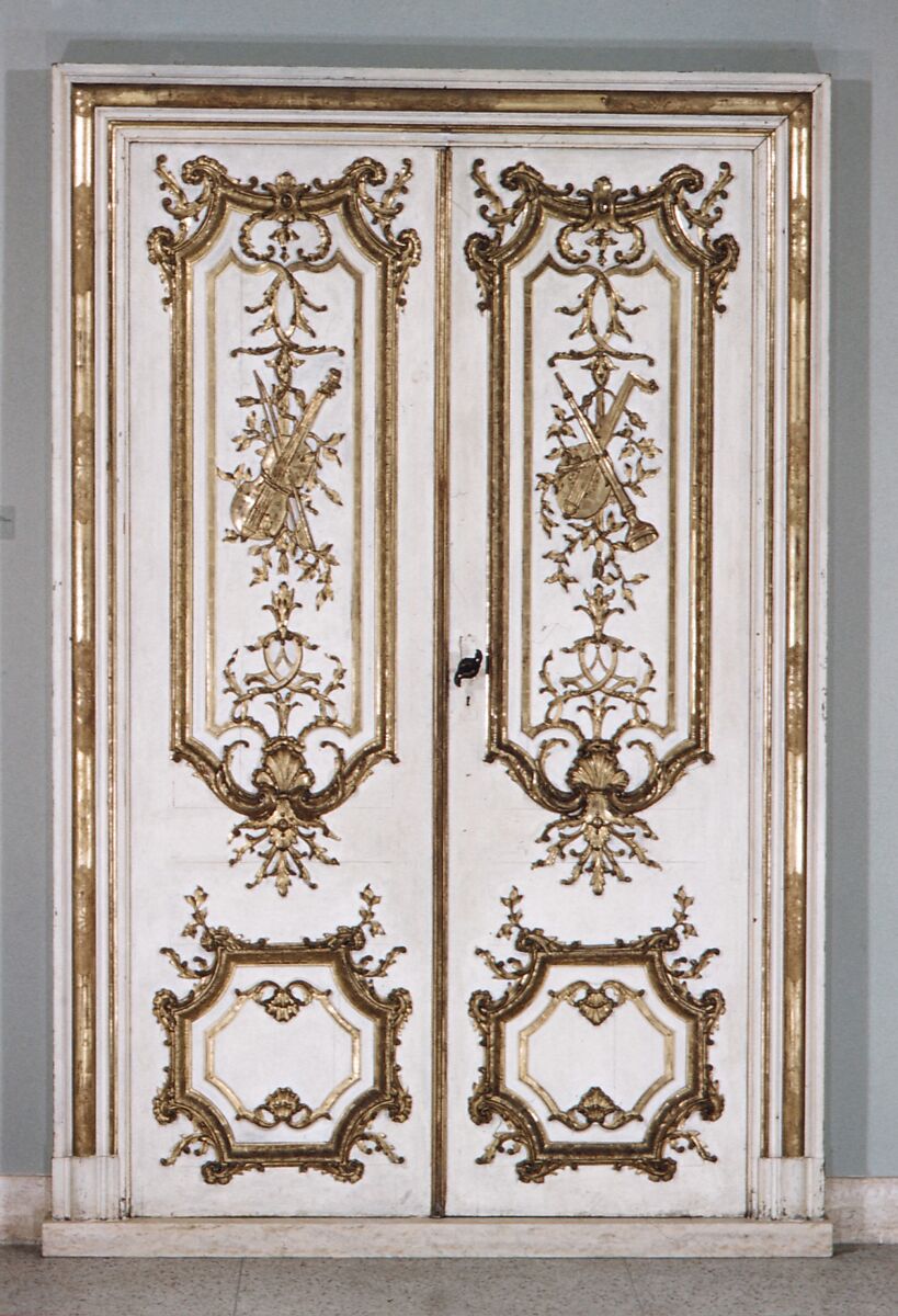 These doors show similarities to the decoration in the Reichenzimmer, a suite of rooms in the Residenz in Munich designed by Cuvillies, and it is thought that they may have come from the Residenz. The doors were most likely shortened at some point.