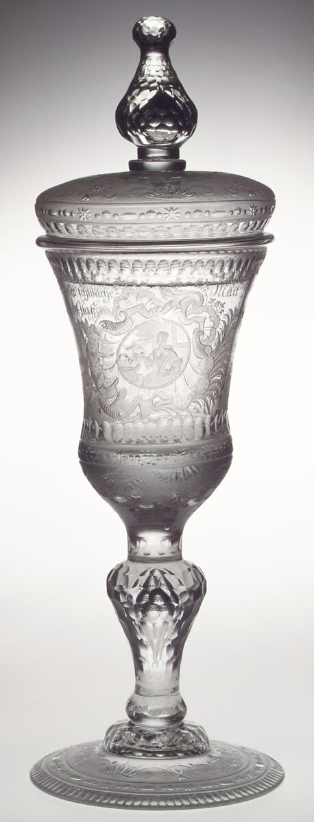 The seated woman pounding a goblet with a hammer refers to the inscription: Man soll die Endrung der, von unsres Freundschaft sagen, ertragen (You could say our friendship is finished if this fragile glass can bear the strokes of a hammer).