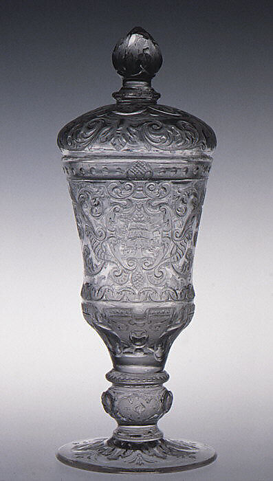 In 1687, a glass engraving studio set up under privilege of Count Christoff Leopold von Schaffgotsch granted to Friedrich Winter, to engrave glass in the manner of crystal. Technique was "Hochschnilt," difficult and rare cameo relief done with aid of water mill specially set up in 1690-91 at Petersdorf in the Hirschberger Tal on the Silesian side of the Riesenbirge mountains. Fir-tree and pine cone, devices of the Schaffgotsch, often figure in the decoration