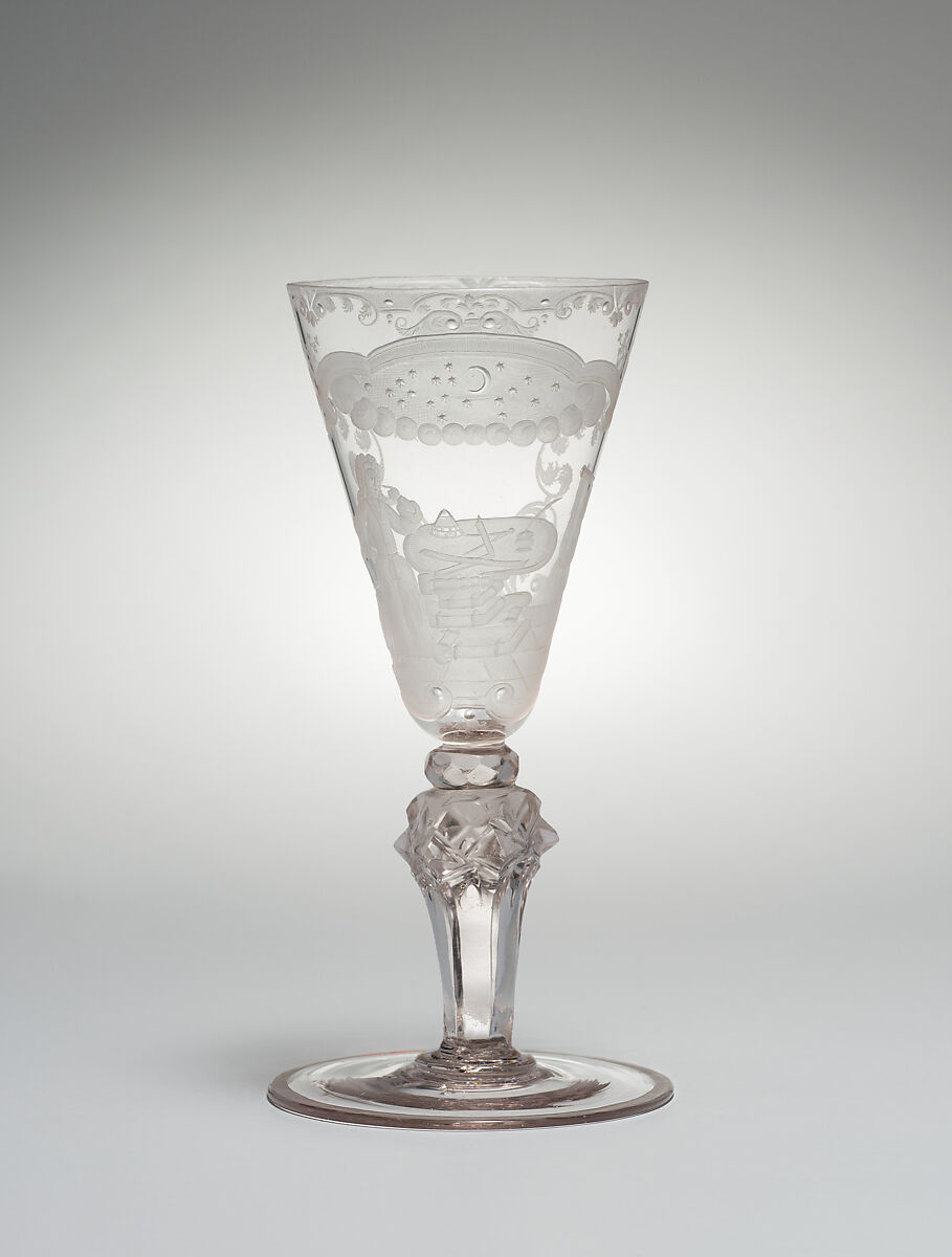 The moon, our closest celestial neighbor, has long been of interest to scientists and artists alike. This etched wineglass shows two eighteenth-century gentlemen, identified by their wigs, studying the heavens with books and scientific instruments.