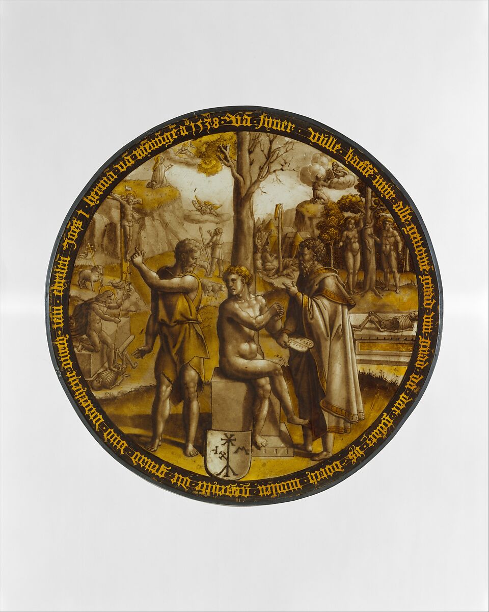 This roundel visualizes verses 16 and 17 from the first chapter of the Gospel of John. Adam, as a representative of humankind, is placed at the center. To his left, Moses stands in front of scenes from the Old Testament, while Saint John to his right gestures toward passages from the New Testament, as if explaining these verses to Adam. The artisan colored the window yellow with silver stain, a silver-nitrate mixture painted on clear glass while cold and adhered with a second firing.
