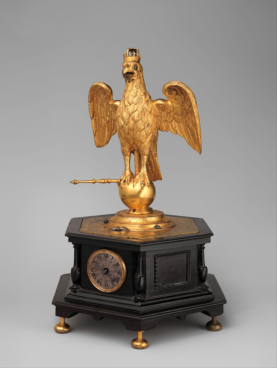 The figure of the eagle on the Museum’s clock, with its wings spread in heraldic fashion, wears an imperial crown, grasps a scepter in its talons, and stands on a gilded ball supported by a circular plinth. The plinth is stepped and ornamented by a natural landscape that is inhabited by tiny figures, including a snail, a snake, and a lizard. The plinth that forms the top of the base for the clock, in turn, rests on a hexagonal brass plate that is engraved with lozenges, alternately plain and matte. The remainder of the base is veneered with ebony and has ebony moldings at the top and bottom of its six sides, five ornamented by rectangular ripple moldings, with turned ebony balusters applied to all six corners. The structure is supported on six brass feet. The sixth side of the case displays a circular silver dial with a single, sculptured-iron hand. The hours on the outer chapter ring are marked one–twelve, and the half hours are indicated by dots. The hours on the inner chapter ring (thirteen– twenty-four) begin at the seven o’clock position instead of the one o’clock—probably a way of using the clock to register Italian hours, which begin at sundown. A small dial on the top of the base and in front of the eagle registers the last quarter hour struck (one–four).