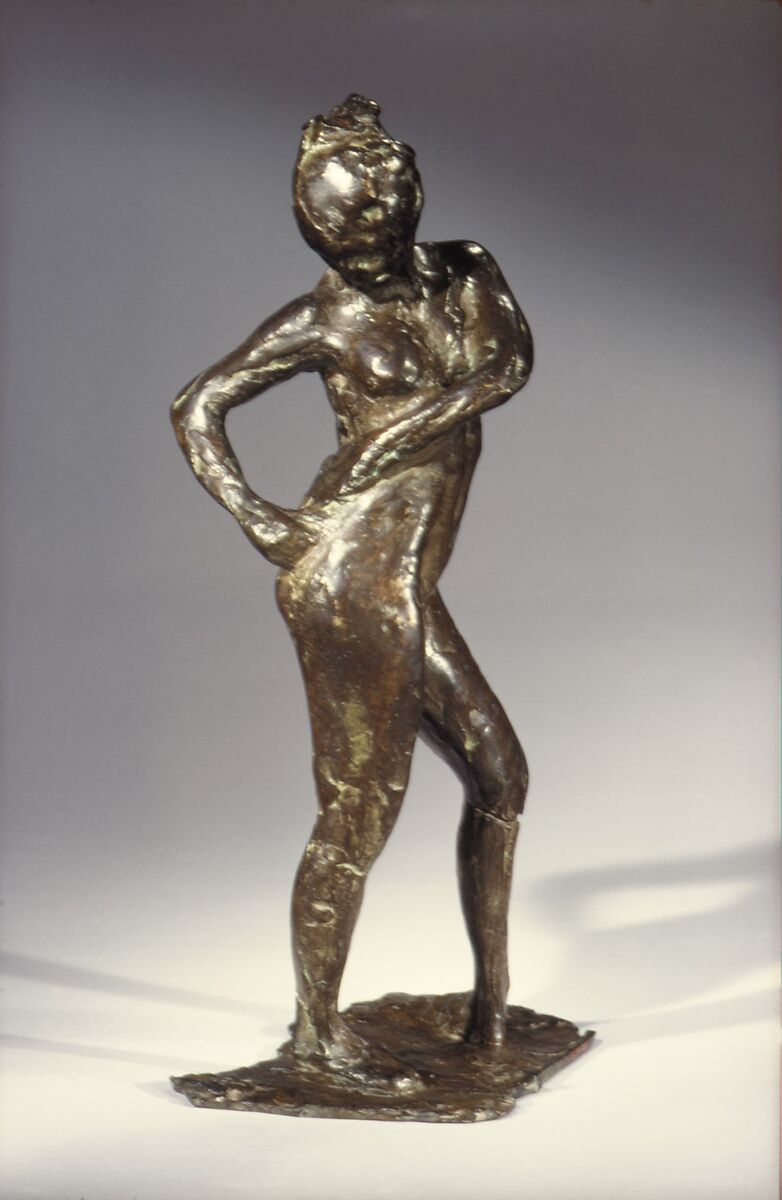 Upon Degas's death in 1917, more than 150 figurative sculptures were found in his studio. Most were made of fragile wax, clay, and plastiline (a wax- and oil-based modeling material). Many had deteriorated. Only a few were preserved in copies that had been cast from them in plaster. Except for the wax Little Fourteen-Year-Old Dancer (Washington: NGA) none of these sculptures had been publicly exhibited during the artist’s lifetime.