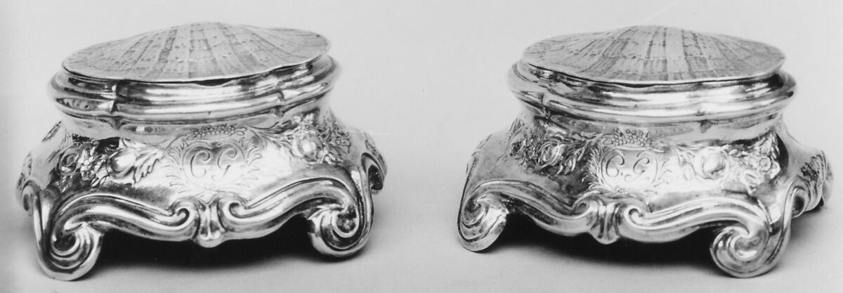 By the late 17th century, salt, which had been contained in extraordinarily ornate receptacles during the medieval and renaissance periods, had lost its prior ceremonial significance. Changes in customs and dining practices led to spice and condiments being used at a diner’s discretion. New, much smaller, forms developed during the eighteenth century. Salt or pepper boxes were generally made in sets so that each diner could have one within easy reach. It is uncertain which spices were contained in these receptacles, although the two hinged scallop-shell covers and the scallop-shell motif on the base may allude to the marine origins of salt.