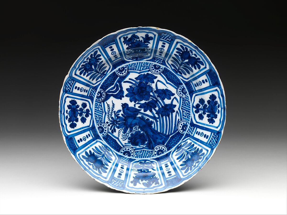 Most likely introduced from the Islamic world, where it had developed in the ninth century in response to imported Chinese ceramics, the use of a tin-based glaze to cover a dark earthenware body has a long history in Europe. Here, the tin glaze is painted with blue pigment on a plate whose shape and design parallel Chinese kraak ware.