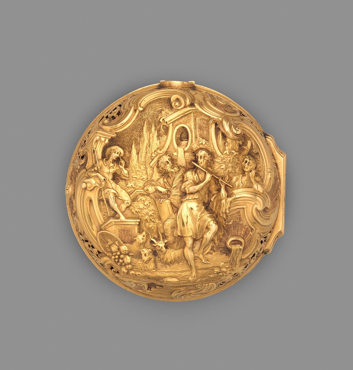 The quarter-repeating movement of this watch is the work of Charles Carbrier II of the distinguished family of London watchmakers. Repoussé gold outer cases for watches were in demand in the mid-eighteenth century, but only a few, like the present example, were signed. The embossed scene illustrates the story of the Greek sun god Apollo, adapted from an etching by Sébastien Leclerc. Ownership of this watch would have demonstrated affluence and familiarity with Greek mythology.