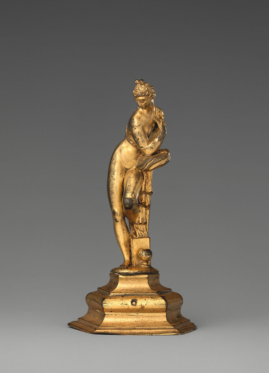 Formerly in the collection of J. Pierpont Morgan, this gilded figure was published in Wilhelm von Bode’s 1910 catalogue of the American financier’s bronzes. Judging it an “early copy of a figure of larger dimensions by Gian Bologna,” Bode assigned it to one of the master’s followers without specifying a precise model, instead giving it the generic title of “Girl Bathing.” The statuette, which entered The Met in 1932, is a reduction of a celebrated bronze in Vienna (p. 00, fig. 126a), signed GIO BOLONGE and listed in imperial inventories from the mid-eighteenth century as a Venus Urania, surely for the presence of the armillary sphere, an astronomical instrument, at her feet. The composition is documented through several copies and variants in different materials, from bronze to ivory and wood.[1] Our statuette faithfully repeats several elements of the model, including the sphere at the base of the supporting pillar, the neatly truncated drapery at the back, and the decorative tooling of the fabric. Of particular note is the complex entwining of the right index finger with the strap that winds around the nude woman’s back and shoulder.