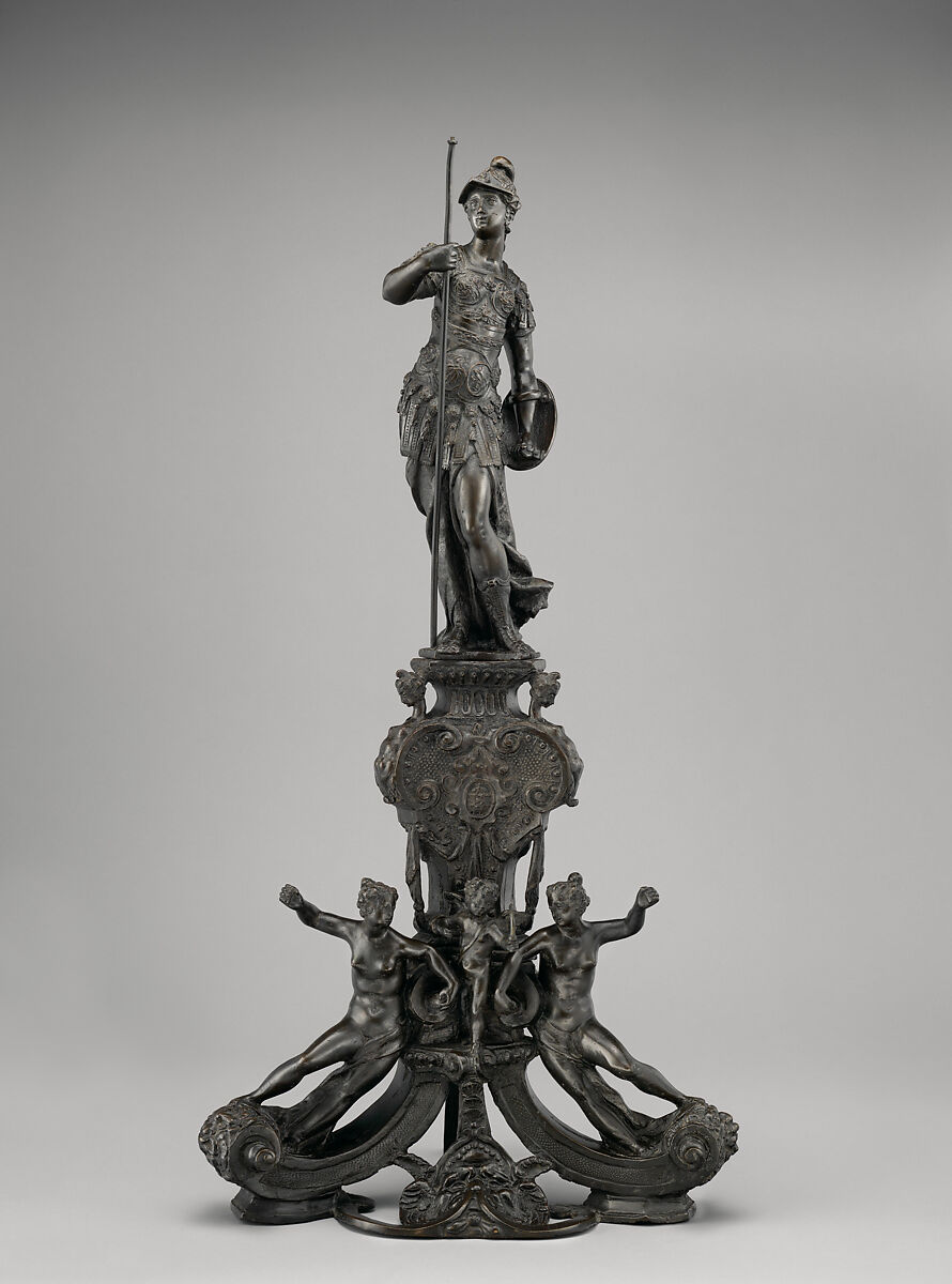 The Friedsam bronzes follow the typical tripartite scheme for these functional objects: a triangular base (for stability), a central section more or less articulated, and a crowning small statuette of a mythological or allegorical subject. Technical analysis conducted in 2001 confirms that the bases and central sections are composed of the same alloy. The heraldic oval at the center of the stem features an eagle, a striding lion, and a grid motif. The surmounting figures, Minerva and Mars, are known through numerous replicas, for instance, casts of the pair in the Kunsthistorisches Museum.[3] These versions are distinguished by variations in detail—the decoration of the breastplates, the helmets, surface finish—as well as production context, quality of execution, and dating. Taken together, they illuminate the dynamics of Venetian bronzeworking in the early modern period, by clarifying how celebrated inventions could be copied and adapted to different objects, often in the same workshop, based on time-honored formal and iconographic conventions.