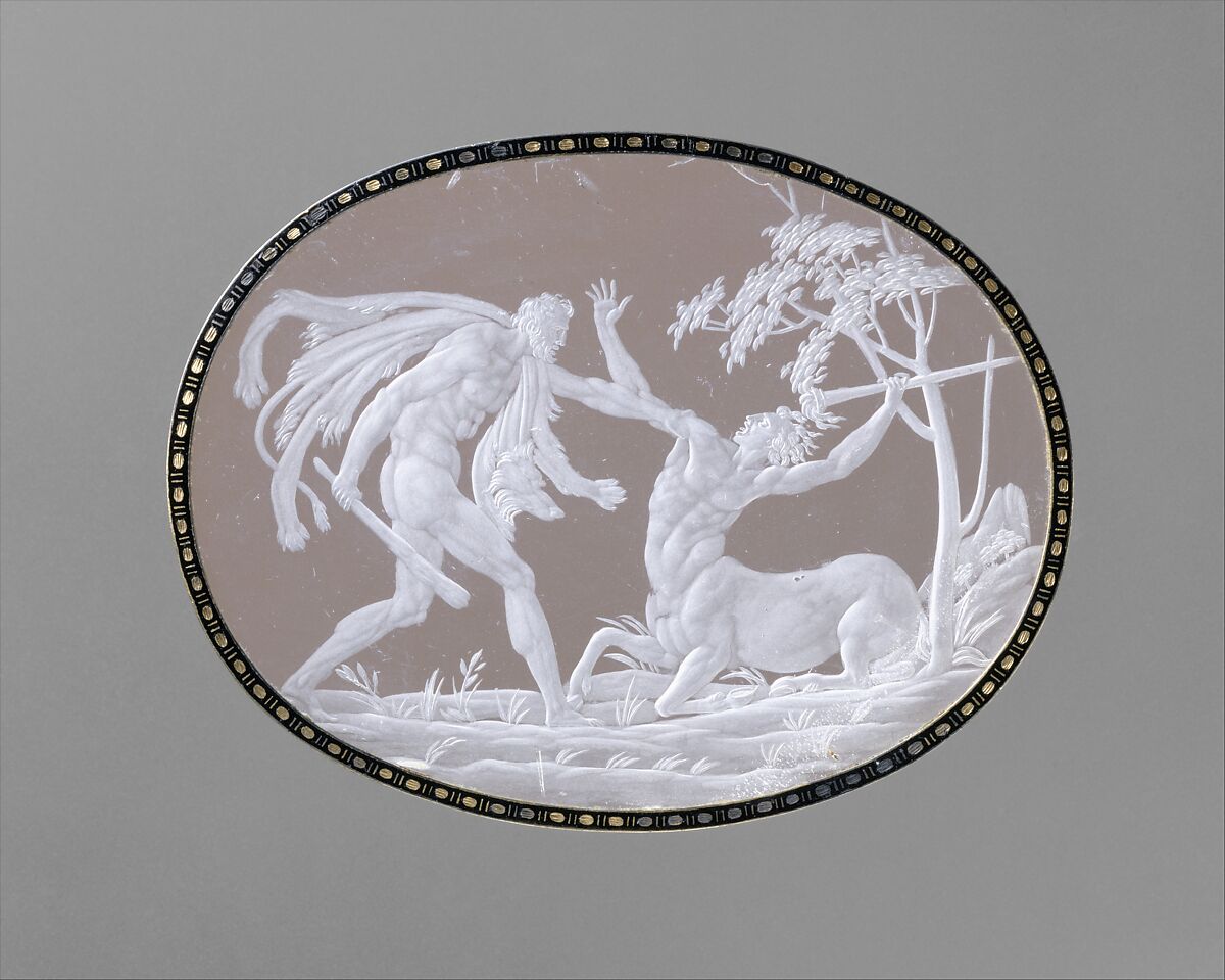 One of the major glyptic artists working in Milan during the second half of the sixteenth century, Fontana engraved exquisitely luminous Late Mannerist scenes from classical mythology and biblical subjects in rock crystal. A casket, set with Fontana's rock-crystal plaques and made for Albrecht V, duke of Bavaria (r. 1550–79), can still to be seen in the Schatzkammer of the Munich Residenz. The Metropolitan Museum's medallion is one of a series of six surviving rock crystals engraved with episodes from the story of Hercules; the medallions were removed from a casket, now destroyed, that once belonged to the Gonzaga duke of Mantua, Vincenzo I (r. 1587–1612). The casket, ornamented with gold and pearls, would have been highly valued as a splendid example of Milanese goldsmiths' work, as well as of intaglio engraving.