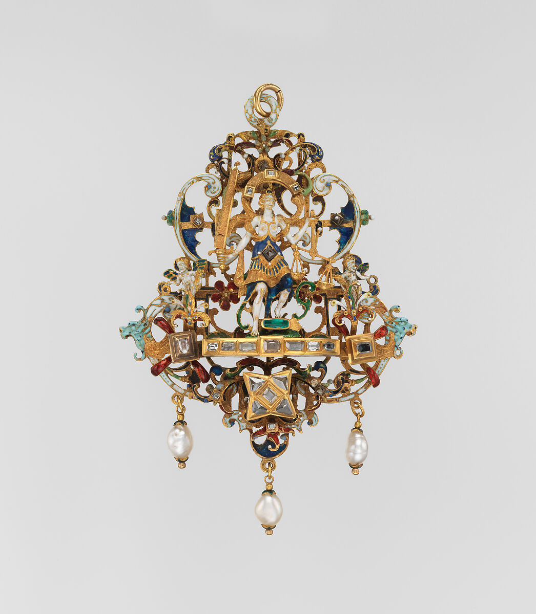 The size of this jewel and related ones (see also 17.190.892; 17.190.893; 32.100.306; and 41.100.26) is such that only the closest viewer could appreciate their full beauty and dexterous execution; they represent the finest craftsmanship for the wealthiest patrons. Each combines gold with natural treasures, such as pearls and gemstones. Bulbous baroque pearls cleverly suggest the fluffy down of a swan’s underbelly or a cloudy mass supporting the Crucifixion. Tiny figures are enameled in the round. Melding the secular and the sacred, these jewels were made to be worn: pinned to garments or hanging close to their owners’ skin. The animals might be heraldic devices; the swan, for example, could symbolize the Society of the Virgin Mary, called the Order of the Swan, which was founded in mid-fifteenth-century Brandenburg in Germany.