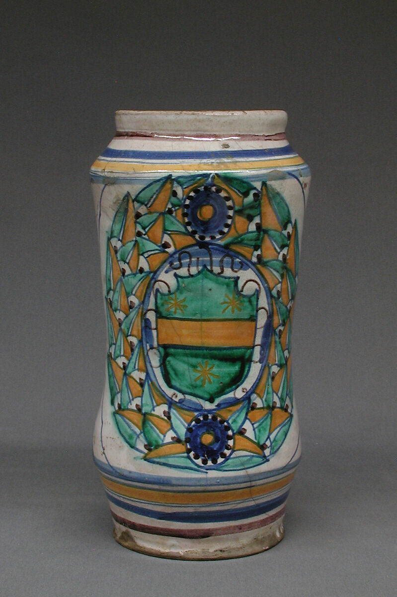 Storage vessels were among the most frequently produced maiolica wares in late medieval and Renaissance Italy. Made in fairly standard shapes, they were designed to fit with dozens of others on a shelf, often in a pharmacy or shop. Their handles therefore tend to fit within the vessel’s profile, and the cylindrical albarello type is generally narrower at the middle than at the top or bottom, making it easy to grip. Other common features include inscriptions indicating contents and flanged lips to help secure cloth or paper seals. The decoration, usually more elaborate on one side than the other, can sometimes link pieces to a known dispensary or specific workshop or artist.
