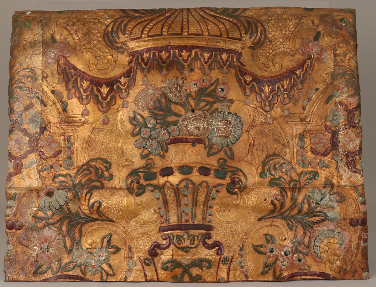 See 34.94.2 for another piece of same wall hanging, derived from a popular textile design by Daniel Marot from ca. 1712. Marot, court architect to William III, greatly influenced the decorative arts in the Netherlands at this time; his publication from 1702–1715 of several series of ornamental designs contributed to the popularization of the Louis XIV style in the Netherlands.