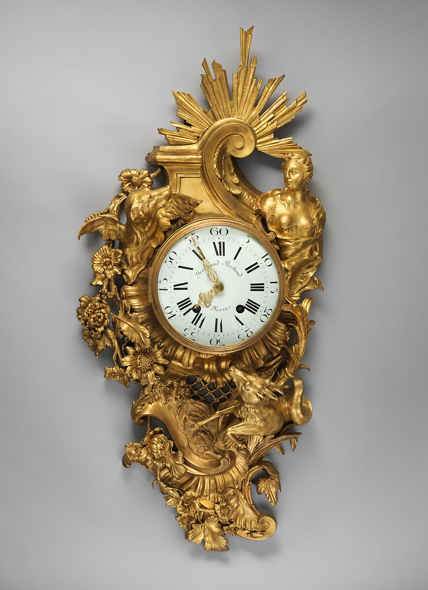 This complicated and highly asymmetrical cartel clock incorporates imagery of Diana, goddess of the hunt. A master of rococo style, Jacques Caffieri was among the most important bronze casters during the reign of Louis XV. By royal privilege, Caffieri was allowed to cast and gild bronze objects in his workshop. According to strict guild regulations, these two processes were normally done under separate premises. The clock’s original movement has been lost.