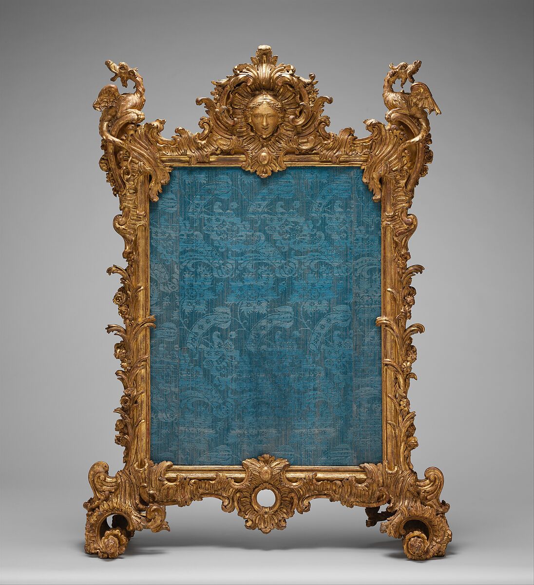 - Medium: Carved and gilded oak; silk panel not original to screen