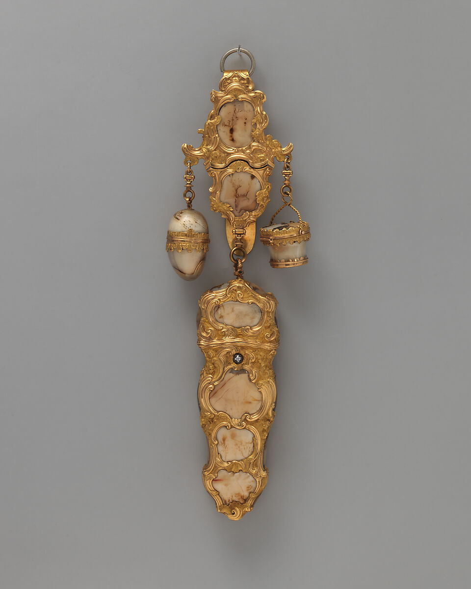 Chatelaines, which hung from the waist, were designed to hold sewing, writing, or toilet implements.