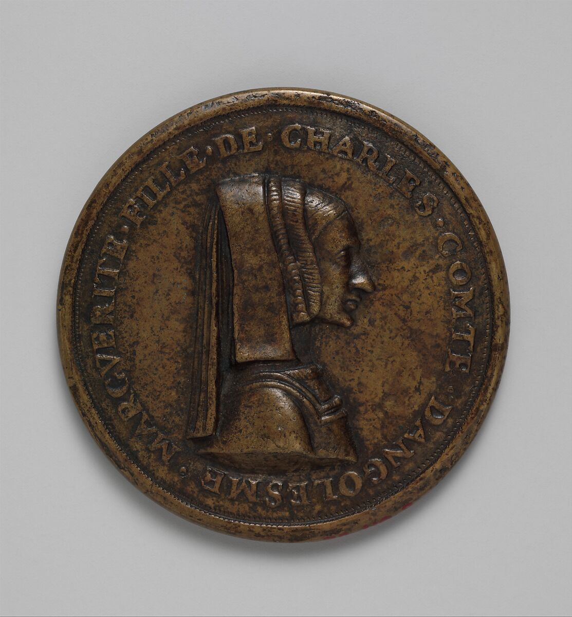 Louise de Savoie (1476–1531), portrayed here in her late twenties, wears a broad, crisp veil that accentuates her youthful profile. A pendant by the same artist showing her son, François, as a child (obverse) and his device, a salamander (reverse), is also in the Museum's collection (48.90.5).