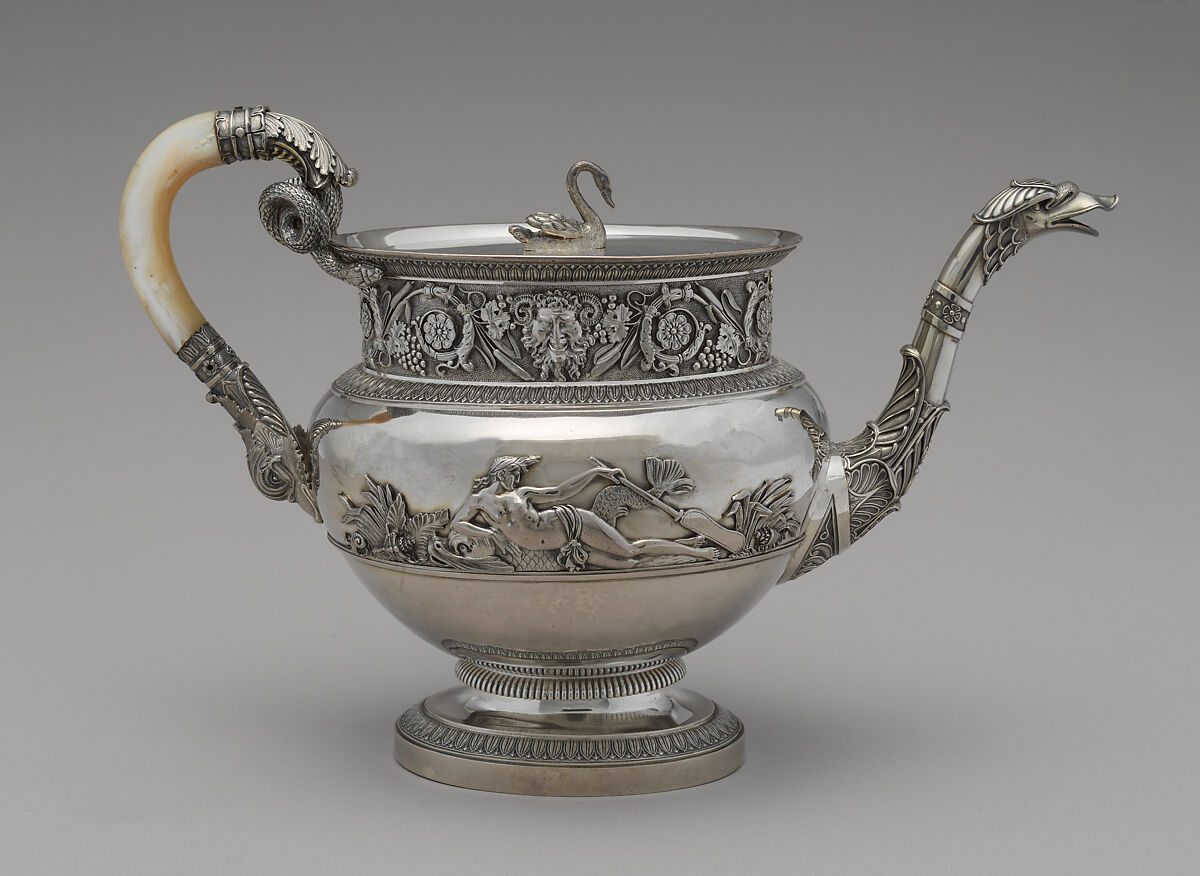 This tea and coffee service (38.12.1–.5) is distinguished both by the enormous scale of its pieces and the high quality of the cast and applied decoration. While its sugar bowl is missing, the service is an unusually grand survivor of silver from the Napoleonic period. The mother-of-pearl handles add to the impression of luxury but also serve a functional purpose, as they do not conduct the heat generated by the hot liquids that the vessels contained.