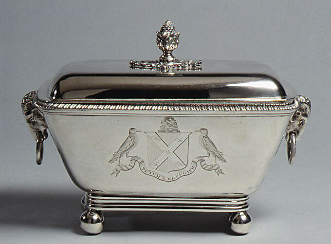The arms, crest, motto, and supporters of the Gillon family are engraved on the side. The vegetable dish, one of a pair and part of a dinner service, is in the form of a classical sarcophagus.