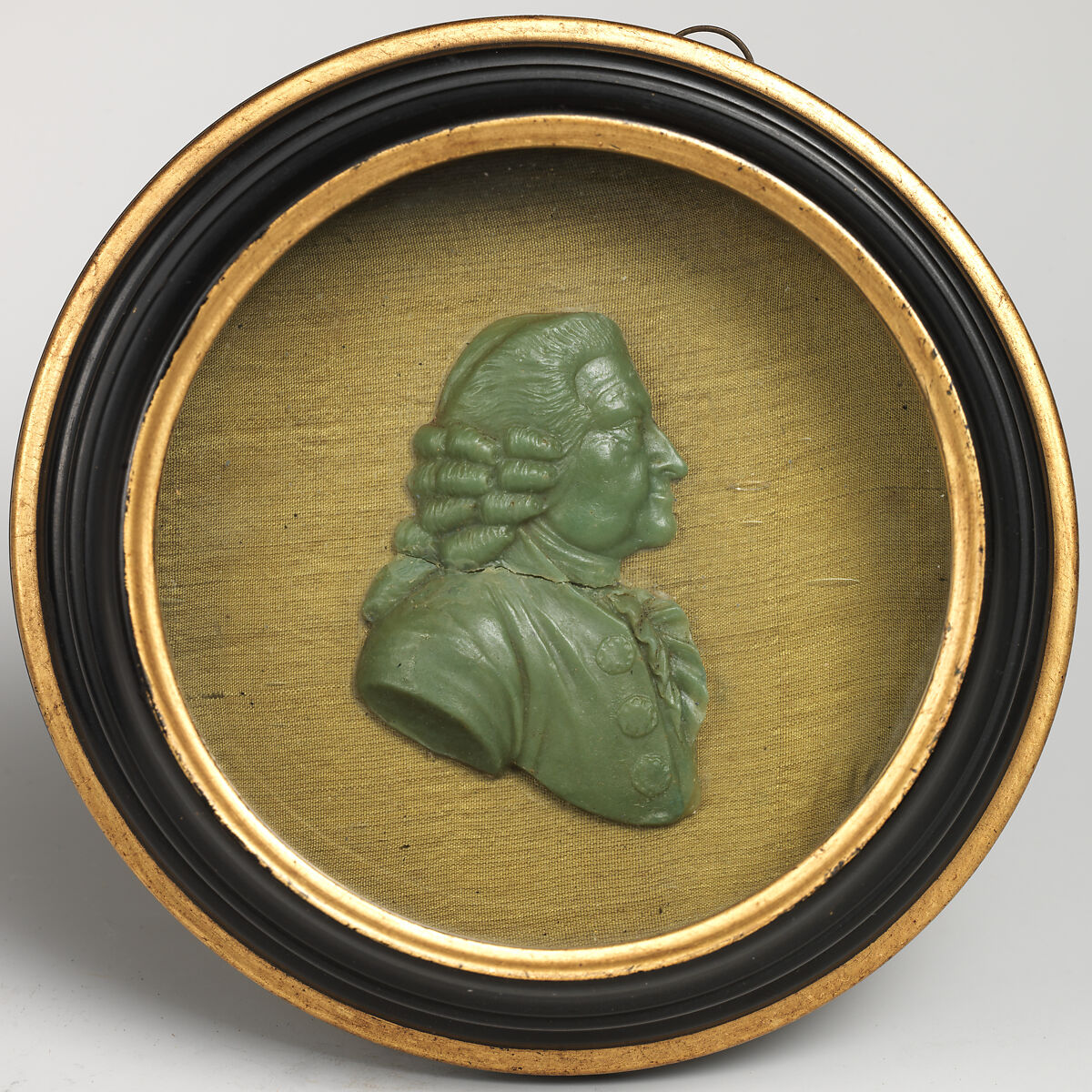 - Medium: Medallion: green wax on olive silk ground; shadow box: black wood with gilt inner and outer moldings, framed with glass