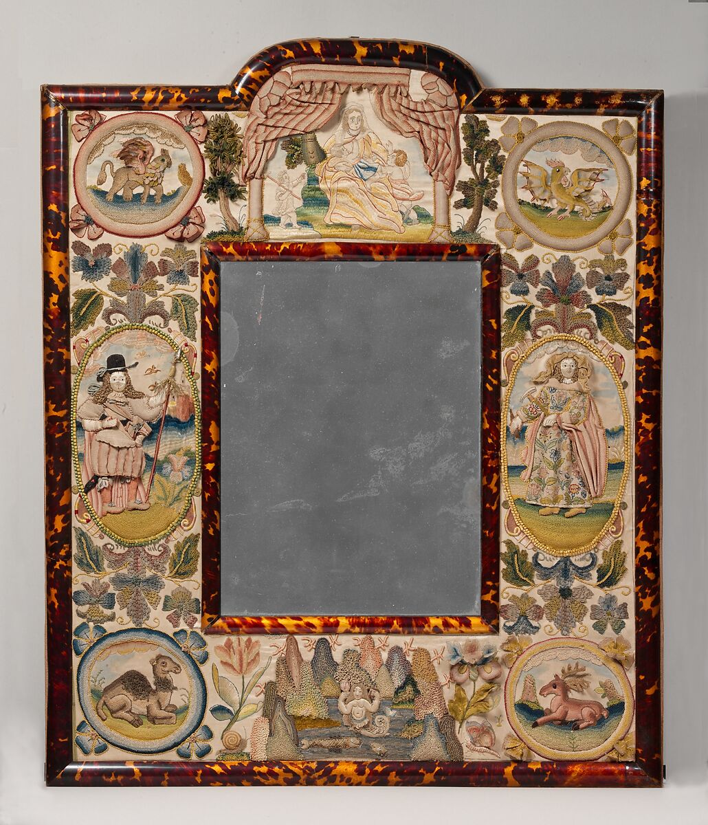 The embroidered decoration of this mirror frame was derived from a printed source such as an illustrated Bible and features a composition similar to that of a decorative title page. The biblical characters Jael and Barak, flanking the mirror glass, appear in the book of Judges. The frame is surmounted by a figure of Charity; animals, mythic and actual, symbolizing the Four Continents, occupy the corners (from upper left): a griffin representing Africa, a basilisk representing America, a stag representing Europe, and a camel for Asia.