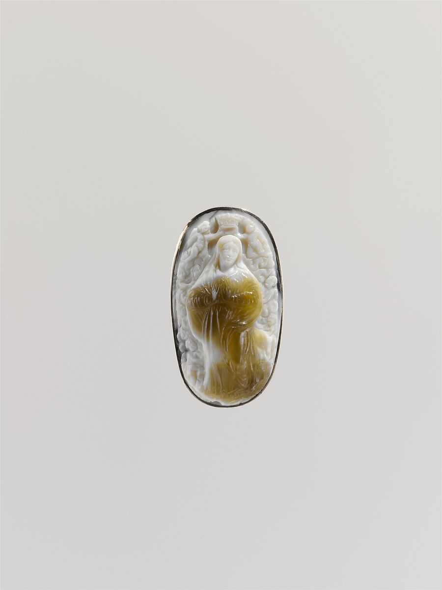 The irregular cloud of smoky brown that floats across the cream layer of this stone eventually helps the viewer to distinguish the Virgin’s robe and her hands raised in intercessory prayer.