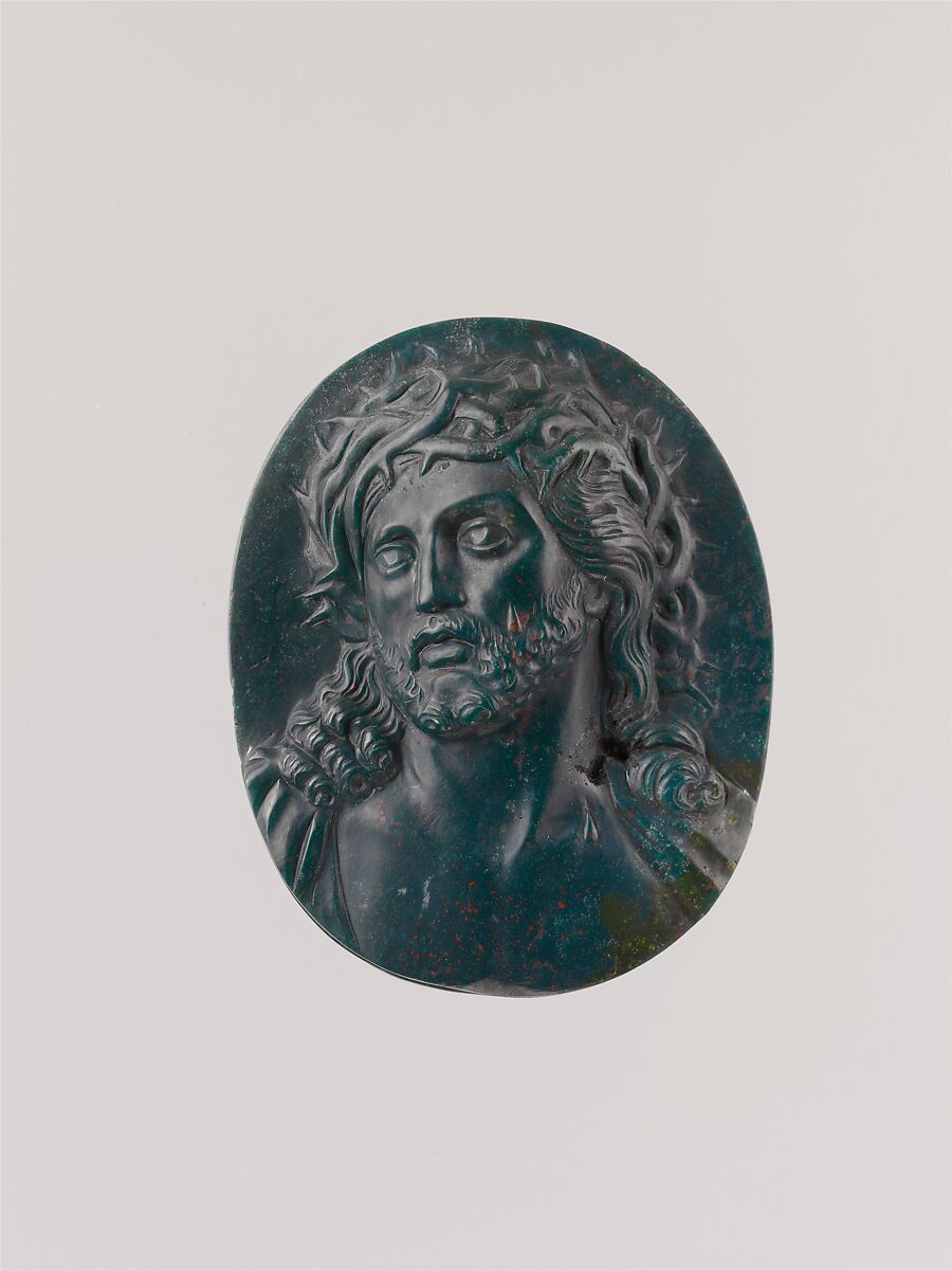 The red iron-oxide specks that occur in heliotrope, or bloodstone, a dark green varietal form of jasper that was much favored in Milan, encouraged the artist to evoke droplets of blood.
