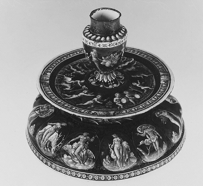The processions of infants on the drip pans were taken from engravings by the anonymous Italian Master of the Die (active ca. 1532). The labors of Hercules depicted on the repoussé medallions around the base of one of the candlesticks are after engravings by the German Heinrich Aldegrever (1502–after 1555); gods of classical antiquity fill the medallions on the other example.