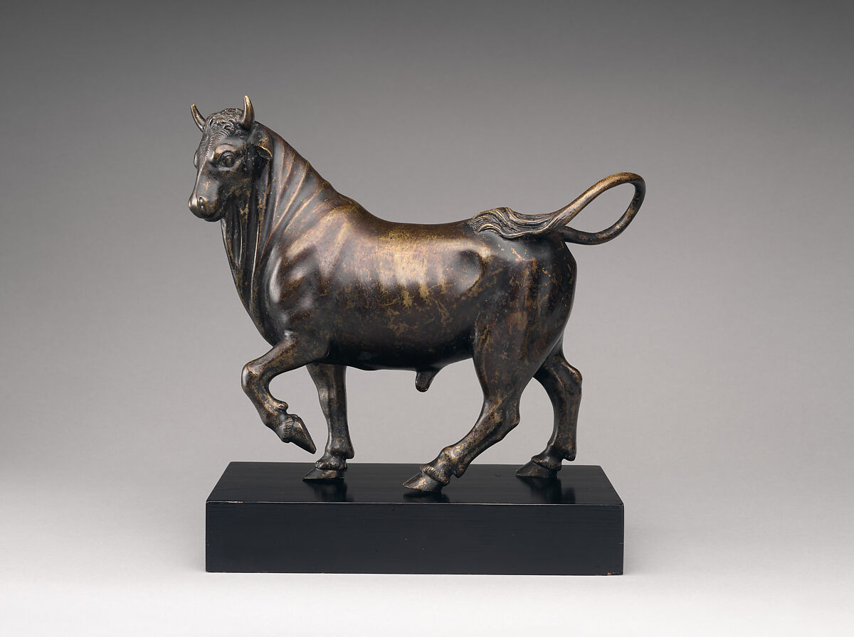 Our bronze, which entered The Met in 1940, diverges from the Bargello and Hill exemplars and, in fact, derives from a different bull model, identified in the scholarship as “Type B.”[4] This variant can be traced back to a statuette, now in the Galleria Colonna, Rome, that was commissioned in 1628 by Jacopo di Lorenzo Salviati from Giovanni Francesco Susini, who based it on a model he inherited from his uncle Antonio.[5] The Type B composition reelaborates Giambologna’s invention (the Type A Bargello and Hill statuettes), stylizing its massive girth into a sleeker anatomy. The more diminutive muzzle is held erect, the dewlap is lighter and less fleshy, the hide between the horns is given an exquisite graphic rendering as opposed to the Type A bull’s more sculptural treatment. Moreover, while the Bargello and Hill statuettes stand on a metallic oval base, typical of Giambologna’s early small sculptures, neither the Colonna nor The Met bronze has such a support.[6]