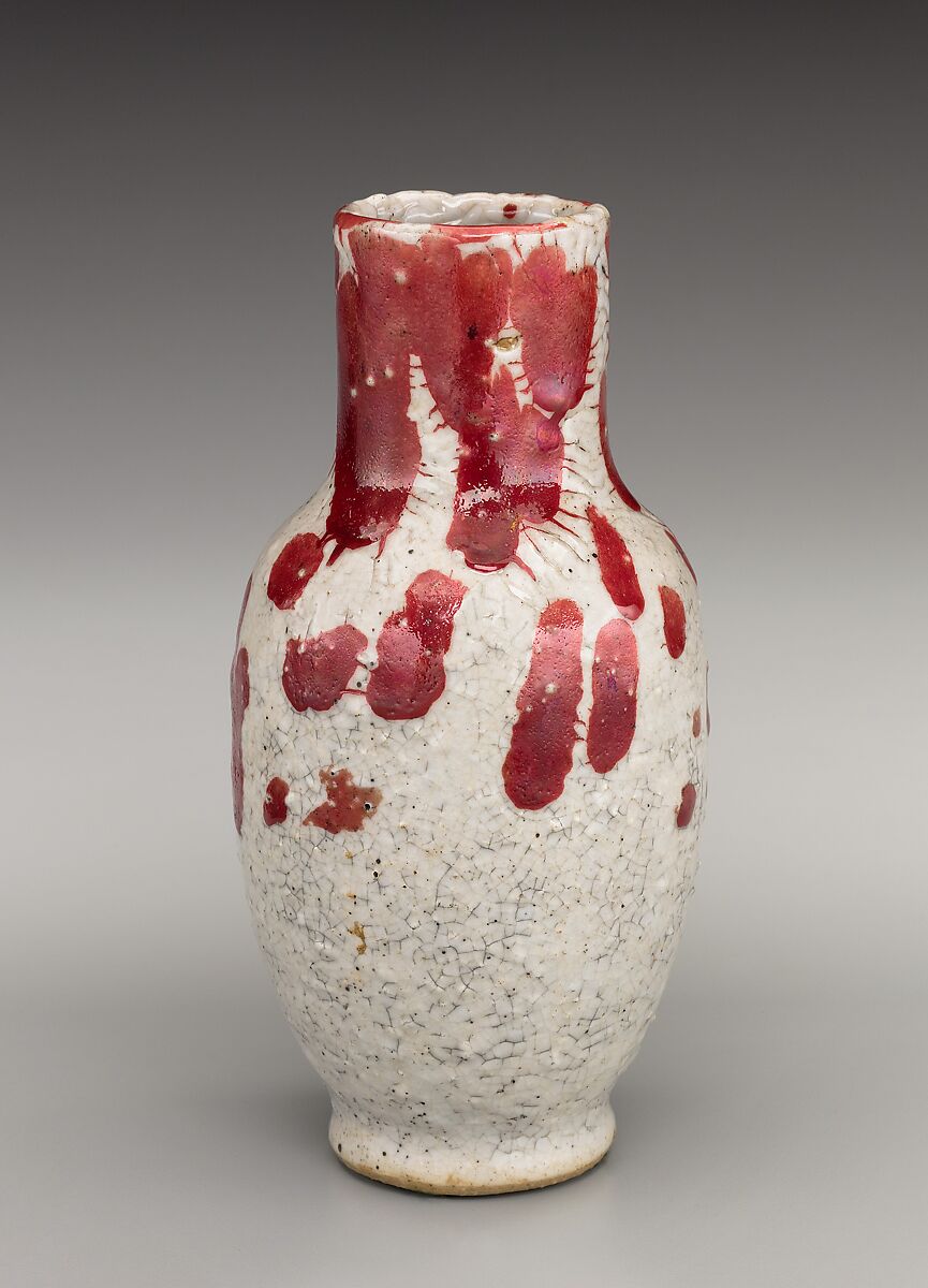 During the 1880s Robertson increasingly turned his attention to developing new glaze formulas and clay bodies. In the middle of the decade he became obsessed with the highly coveted yet elusive sang-de-boeuf, or oxblood, glaze, a quest that became the hallmark of his later career. In April 1885 Robertson became the first American to successfully replicate the oxblood glaze, showcasing his new oxblood glazes on the same Chinese-inspired shapes that he used for his monochrome glazes. As all-consuming as his pursuit of the ideal oxblood glaze was, Robertson also pioneered other glazing techniques, among them the craquelé glaze, which he first achieved in 1886. This distinctive type of glaze, with its fine network of visible cracks, was a staple of Eastern ceramics that Westerners tended not to emulate because they considered such crazing a flaw. Appreciating its aesthetic value, Robertson perfected an allover white crackle glaze. This vase bears this distinctive crackled effect but is enlivened on its upper half with splatters of a bright, raspberry red sang-de-boeuf glaze, offering a striking contrast of colors and a boldly abstract design.