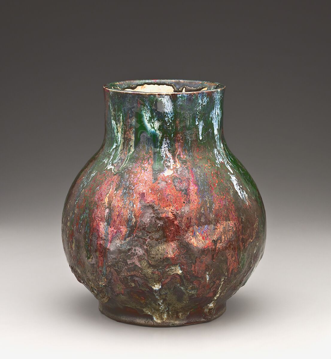 From Chelsea to Dedham, Robertson continued to pursue his passion for innovation, employing the grayish-white stoneware used for Dedham’s dinnerware to throw simple forms covered with bold combinations of colored and textured glazes. Dedham Pottery’s vases are larger, thicker, and heavier than their Chelsea predecessors, and simple, solid forms predominate. Many of the Dedham vases in the Ellison Collection at The Metropolitan Museum of Art have varying combinations of red, green, blue, and white glazes, often with heavy drips descending to the base. On this example, Robertson applied several glazes of different colors. In 1898 a writer for the magazine Arts for America probably had such a vase in mind when he wrote of the Dedham Pottery: "In high-fire work the temperature ranges between 3,000 and 4,000 degrees, and the glaze applied to the top of the vase bubbles like pitch and runs down the sides, coating the surface. In this class of work it is impossible to have the effects twice alike, for at the different firings the chemical conditions vary."